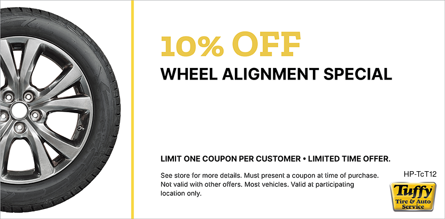 Good only atTuffy Bloomington Expires 07/15/26 Schedule Service Print coupon Share to Google Share to Facebook Offer details 10% Off Wheel Alignment * See coupon for exclusions. Email Coupon First name * Last name * Email address * Sign me up to receive future offers via text from Tuffy Bloomington: Via Text Cell/Mobile Phone By clicking "I accept" below, I expressly agree to receive marketing text messages made by or on behalf of Tuffy Bloomington to the telephone number(s) I’ve listed above. I understand that I may receive such text messages by the use of Automatic Telephone Dialing Systems (including “Predictive Dialers” or “Autodialers”) and I agree to receive them even if I have registered my number(s) with my state or federal Do-Not-Call list(s). I understand that such text messages will include advertising containing offers for goods or services and that I may revoke this consent at any time by telephone, return text message or by Visiting tuffybloomington.com/stop to unsubscribe. Message and data rates may apply. I also understand that I am NOT required to provide this consent as a condition of purchasing goods or services. I accept View: Text Specials Terms and Conditions with this link.